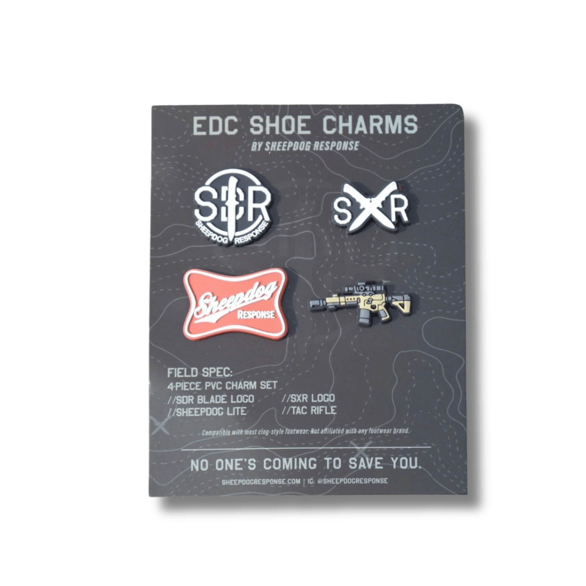 The Sheepdog Response EDC Shoe Charms are a 4-piece PVC charm set designed to bring the EDC ethos to everyday wear. Clean, low-visibility, and mission-driven, each charm represents readiness, identity, and the responsibility to protect.